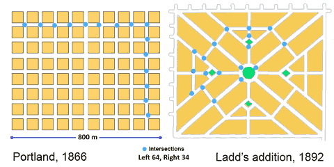 ![]() Figure 1. The Portland Grid and Ladd's Addition layouts - same scale While the article recognized the grid's high legibility and walkability, it pointed out that these valued characteristics were, evidently, insufficient to create a following. There has been no copy of it in North America or elsewhere since 1866. We observed that even in Portland itself, and shortly after its platting, deviations from its stereotypical grid started to emerge, an example of which is Ladd's Addition (1891). It turns out this Addition was an extraordinary and remarkable deviation. By coincidence, as our critique surfaced, the American Planning Association (APA) named Ladd's Addition "a great neighborhood" under their ongoing program that recognizes planning achievements. Then new research appeared on "Emergent Neighborhoods" (EN) by four well-known urbanists that revealed the 400-m rule and the importance of "sanctuaries". Ladd's neighborhood, it would seem, is a living demonstration of these two concepts. The "great neighborhood" designation and the new research findings spurred a revisit of the Portland grid with a focus on a potential transformation that would amend its weaknesses and in the process of doing so offer a template for other existing cities that are laid out in uniform, undifferentiated grids. This re-think also responds, belatedly, to a challenging comment: "....Rather than this grab-bag of criticisms, it would be more useful to develop a consistent positive alternative to the Portland grid". The Ushers of OpportunityThe APA follows a rigorous selection process and uses a clear set of criteria for awarding a neighborhood the status of "great". In the case of Ladd's Neighborhood the rationale presented for awarding the title was as follows: