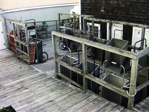 ![]() Handcart storage near the dock ©2012 J.Crawford Cherry Grove offers some useful lessons in the logistics of carfree communities. People walk everywhere (there are not even any bicycles). Handcarts are used to move things from the ferry landing to their houses and businesses, none of which are as much as a mile from the dock. The businesses, in fact, are all clustered near the dock. Handcarts are available right at the landing.