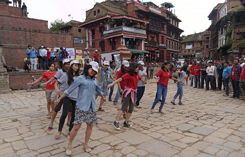 ![]() Flash Mob performs at the Bhaktapur event 2014 Bansidhar Sainju, Carfree.com On 25 September, Bhaktapur celebrated its carfree day event by restricting vehicles from 6:00 AM to 9:00 AM in Taumadhi square. Groups that had never worked together before came together to make the event a success. On 26 September, Bhagwan Bahal, a stretch in Thamel, celebrated carfree day with treasure hunt programs, street art, an art exhibition, skate board stunts, and other activities. With enthusiastic response and support from local business owners, a larger stretch than had been planned was made carfree on this day. On the last day, 27 September, World Tourism Day, the program ended in Basantapur with a variety of activities.
