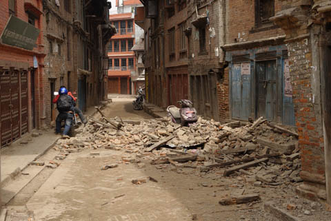I was in our house near Dattatraya Square when the 25 April 2015 Nepal earthquake struck minutes before noon local time. The initial shake was magnitude 7.8, 7.9, or 8.1 depending on your source (Wikipedia reports all three numbers.). Ground motions were heavy and comparable to my experience of the Loma Prieta earthquake in San Francisco in 1989. The Kathmandu Valley is reported to have shifted 3m (10 feet) to the south.