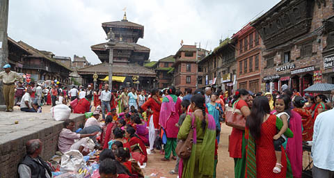 During the month of Shrawan, women queue for hours on Mondays to worship at the temple in Dattatraya Square, Bhaktapur, Nepal.