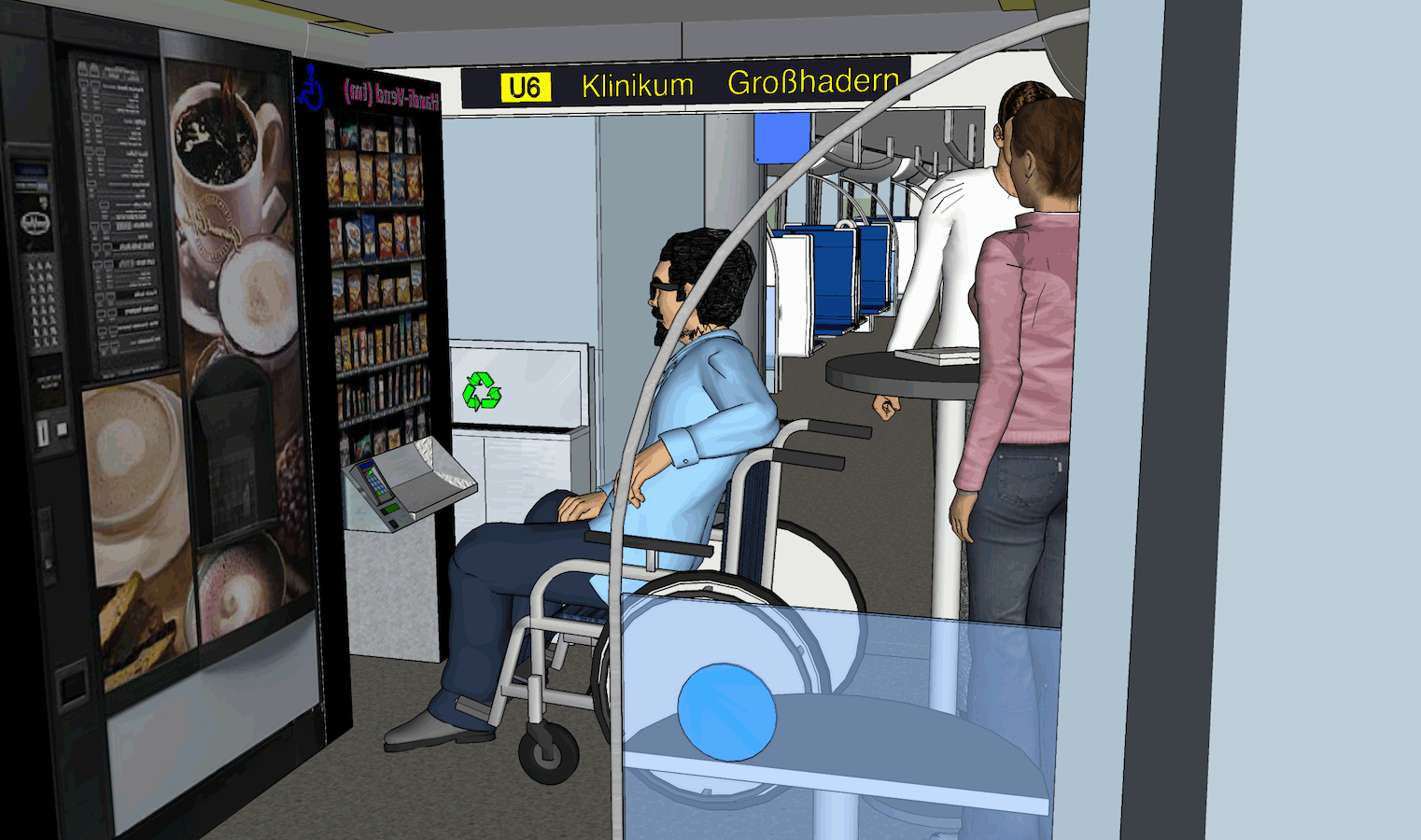 Wheelchair users should be able to board a transit vehicle just as easily as a person on foot. The vehicles must have level boarding for roll-up rides and not require seat belts to secure the chair. With nobody standing there is always plenty of room for one or two wheelchairs per door of rail vehicles. Again, buses are a bad match for wheelchairs. Buses have a higher floor than trams because of their larger wheels, and lack of fixed guideway means being flush to platform is impossible. Thus level boarding requires elevated platforms with mechanical bus ramps as well as driver-assisted seatbelts to secure wheelchairs. Modern trams can arrive with their entryways horizontally and vertically flush with a normal curb.