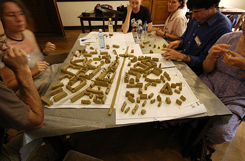 LeitartikelEin Ton-Modell bei der TCFC VTeilnehmer gestalten StadtentwicklungJ.H. Crawford![]() Teilnehmer der TCFC bauen ein Ton-Modell Teilnehmer der 'Towards Carfree Cities'-Konferenz konstruierten ein Modell aus Töpferton. Die Konstruktion dauerte einen Tag, die Auswertung die beiden folgenden Tage. Das Modell stellte einen Stadtbereich einige Kilometer nordwestlich des Stadtzentrums dar. Wir hofften, dass das Modell die Errichtung eines autofreien Bezirks in dem wirklichen Bezirk anregen könnte, der etwa die halbe Größe des Referenzbezirks hat. Zweck der Übung war, verschiedene Theorien zu erproben, die ich entwickelt habe. Ein Ton-Modell war dabei der Zugang, der einer Erprobung in der Wirklichkeit am nächsten kommt. Das Fehlen einer Perspektive auf Augenhöhe wich von dem Verfahren ab, das ich im Carfree Design Manual vorschlage, doch das andere stimmte damit überein. Wir konnten einige Hypothesen betreffend der Teilnahme an der Gestaltung, der technischen Gestaltung (anders als auf Papier), des Entstehungsdesigns und der mittelalterlichen Straßenanlage ausprobieren. Der Vorgang überprüfte auch die Bereitschaft und Fähigkeit von Laien, Räume zu gestalten, die sowohl den technischen Anforderungen eines autofreien Bezirks als auch den ästhetischen Überlegungen genügen, die ich in meinem Buch darlege. Wir untersuchten auch, in wie weit Menschen mit einer gewissen Vorbildung anderen dabei helfen können, einen urbanen Lebensbereich zu gestalten. VorbereitungenDie Grüne Jugend Ungarns (Zofi) stiftete das Modell und sorgte für die mühseligen Vorbereitungen. Die Gegend, die wir modellierten wurde kurzfristig ausgewählt, doch Mitglieder von Zofi schafften es dennoch, Fotos und Vermessungskarten im Maßstab von 1:500 zu beschaffen. Die Übung war daher recht wirklichkeitsgetreu, auch wenn die Stadtplanung noch gar nicht angefangen hatte.Etwa 18 Leute dienten als Moderatoren und Teilnehmer. Ich traf mich einen Tag vorher mit ihnen um Methoden und Ziele zu umreißen. Ich legte meine Vision von teilnehmender Gestaltung dar und stellte kurz das Referenzdesign vor. Ich erläutere ebenfalls mein Eintreten für die Rückkehr zu einem mittelalterlichen Stadtbild. Während das Modell gebaut wurde halfen die Vermittler anderen Teilnehmern und führten auch eine Menge Arbeit am Modell aus. Erste SchritteDie Gegend war weiter als ideal vom Stadtzentrum entfernt, doch dies gleicht sich durch die Kreuzung zweier Zuglinien aus. Aus verschiedenen Gründen war die Ostseite des Bezirks für eine Umgestaltung ungeeignet. Wir modellierten daher nur die westliche Hälfte, die einen großen Abwasserkanal und die Ruinen eines römischen Amphitheaters enthielt. Die gesamte Gegend ist sehr flach.